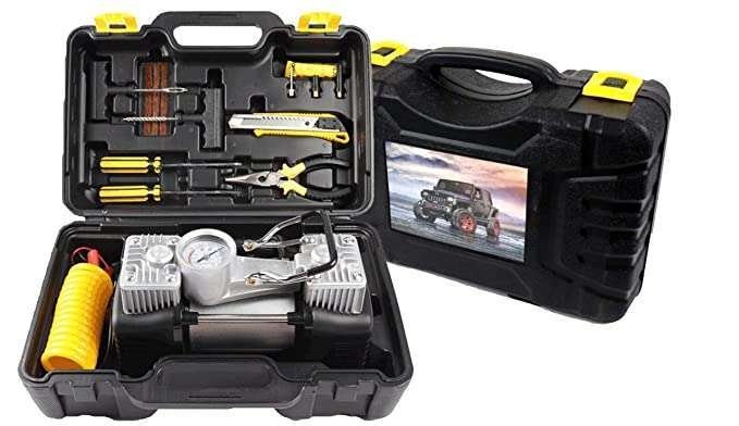 Car Double Cylinder Air Compressor Tyre inflator with Analogue Tyre Pressure Gauge with Puncher Repair Kit